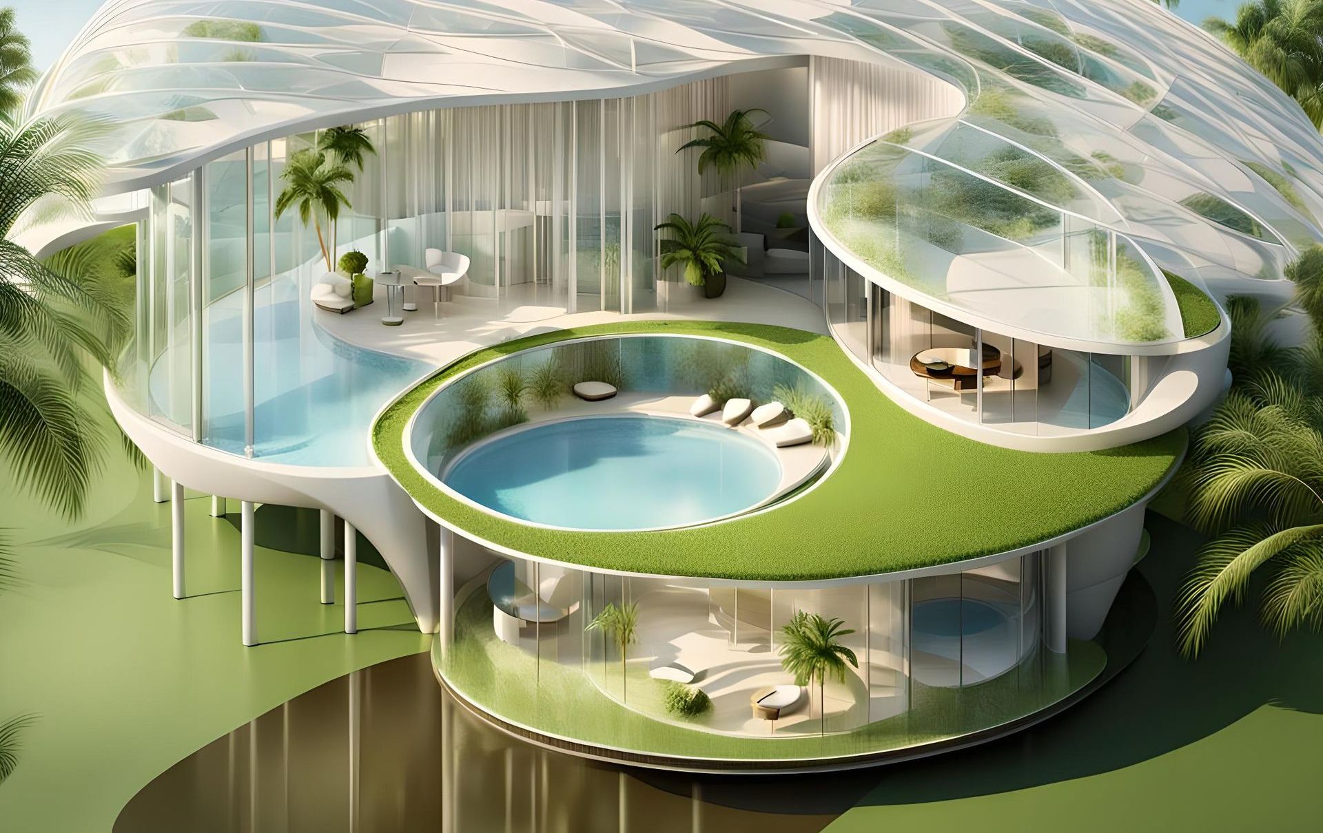 Eine ECO-Village mit Wellnescenter, Pool, Coworkingspace und vielem mehr, z.B. Zugang zu einem Beachresort!
